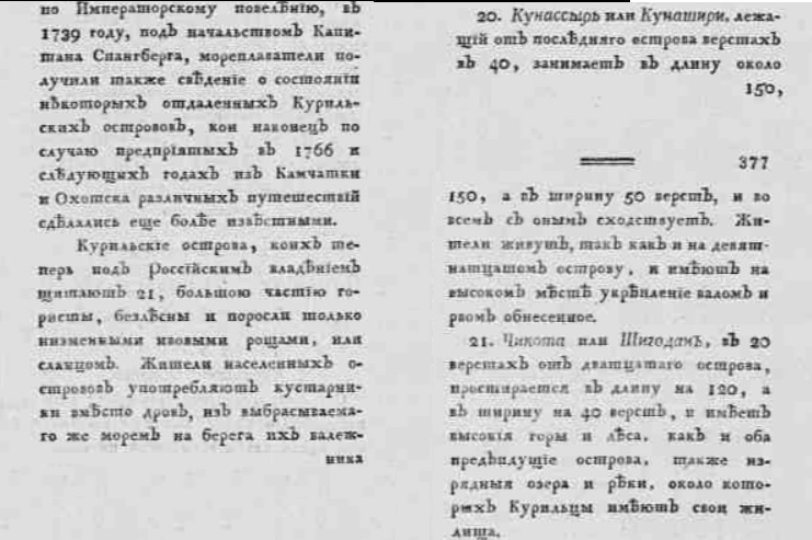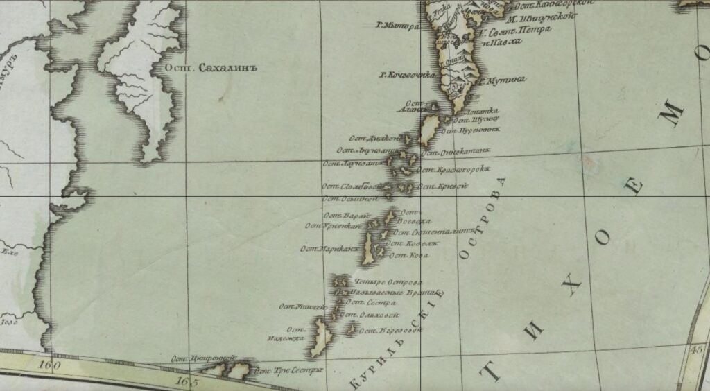 В изданном в 1787 году по Высочайшему повелению императрицы «Пространном землеописании Российского государства…» приведен список Курильских островов, «коих теперь под Российским владением считают 21…». 21-м островом был Шикотан, а о 22-м, Матсмае (Хоккайдо), говорилось, что в южной его стороне имеют японцы город, а сколь далеко простирается их владение в северной стороне Матсмая — неизвестно.