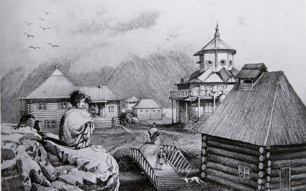 Русское поселение в Ситке, Аляска (литография 1821 г. с рисунка F.H.von Kittlitz). Похожие поселения были основаны и на Курильских островах.
