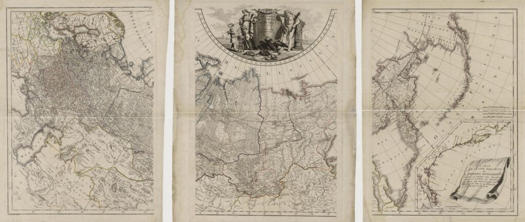 Карта Российской Империи, в составе которой — все Курильские острова. Carte Generale de l’Empire de Russie divisee en Quarante deux Gouvernemens / Comp. par Alexander Vilbrecht. – [Санкт-Петербург]: 1793. – 67х47 (86х62), 3 л. Раскрашенная гравюра.
