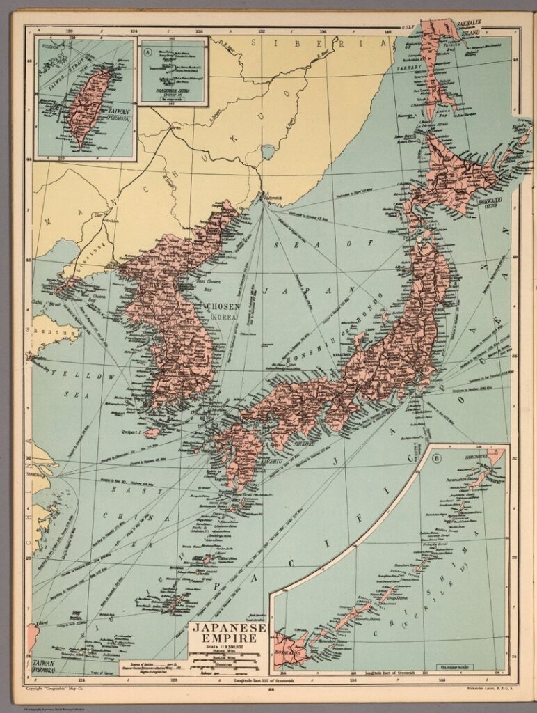 Японская Империя к 1935 году, без учёта зависимых территорий. В её составе в т.ч. — Тайвань, Корея, Ляодунский полуостров, Южный Сахалин и Курильские острова.