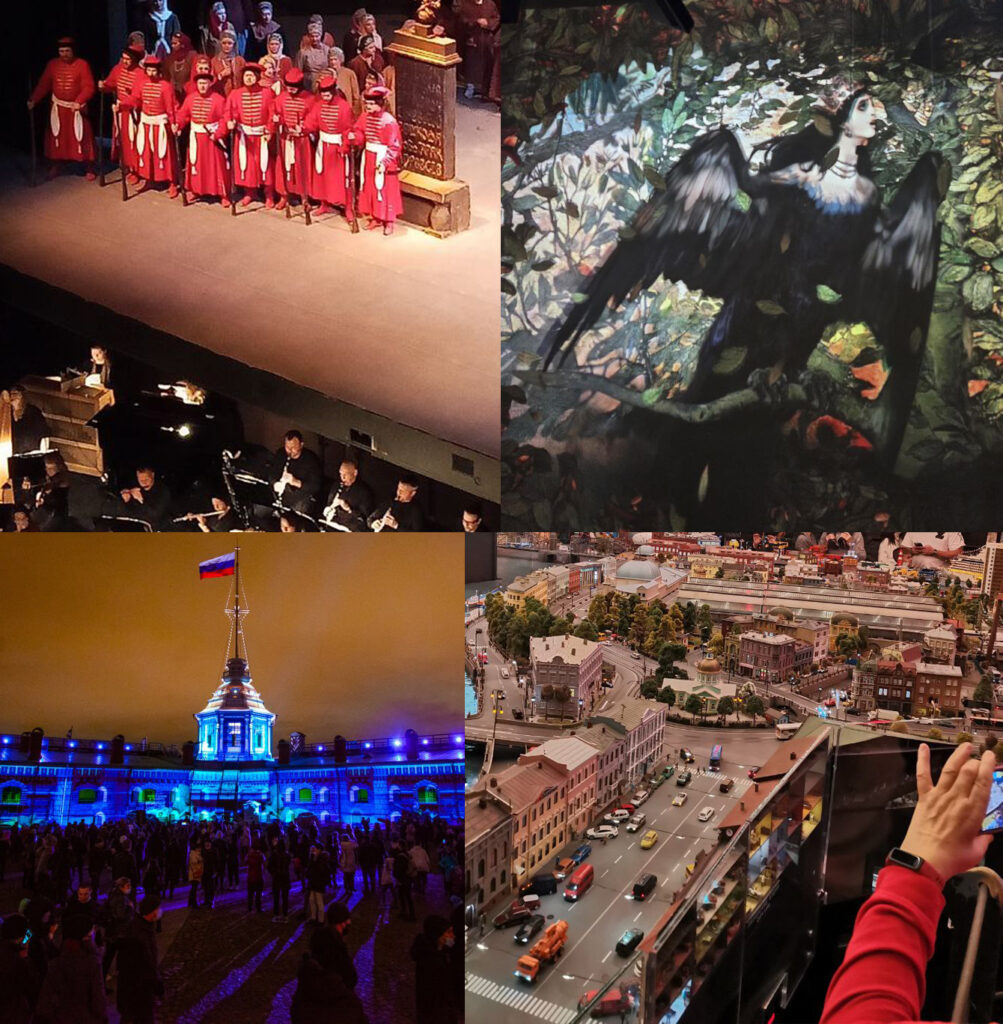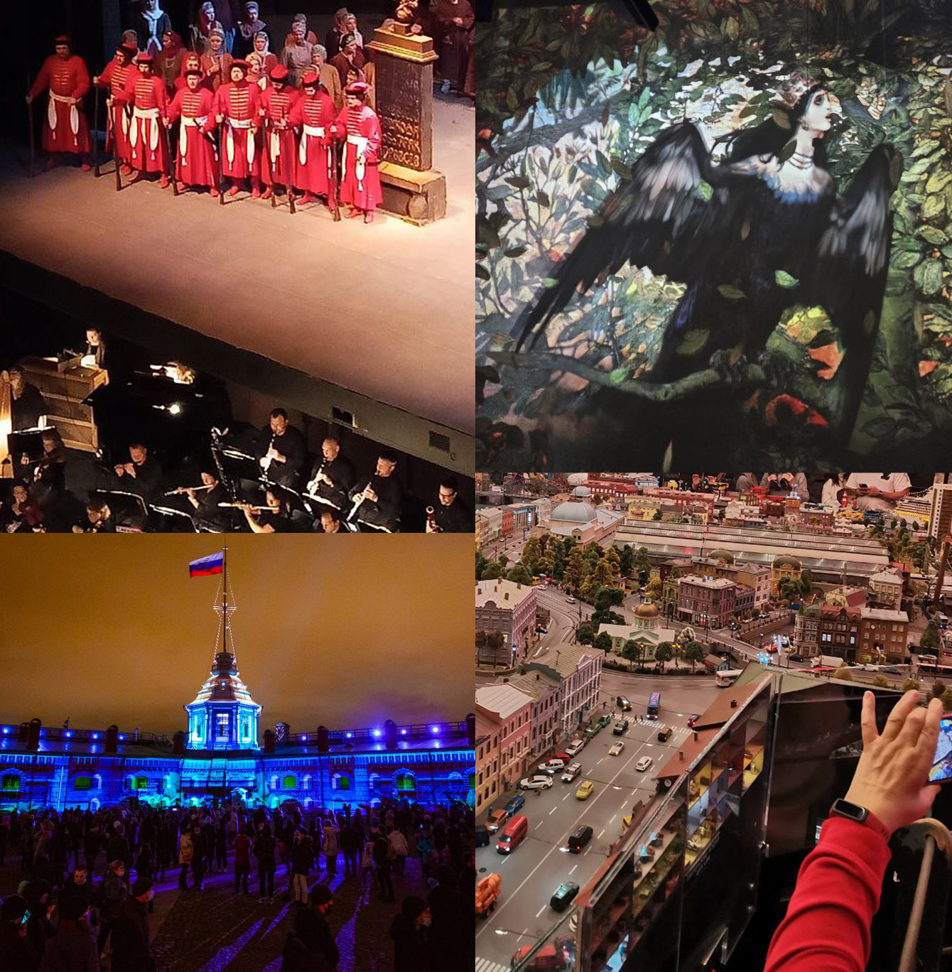 На фото: часть мероприятий, посещённых националистами. Опера М. Мусоргского «Хованщина», мультимедийная выставка «ожившие шедевры русских художников», световое представление у Петропавловской крепости и посещение экспозиции Гранд-макета России.
